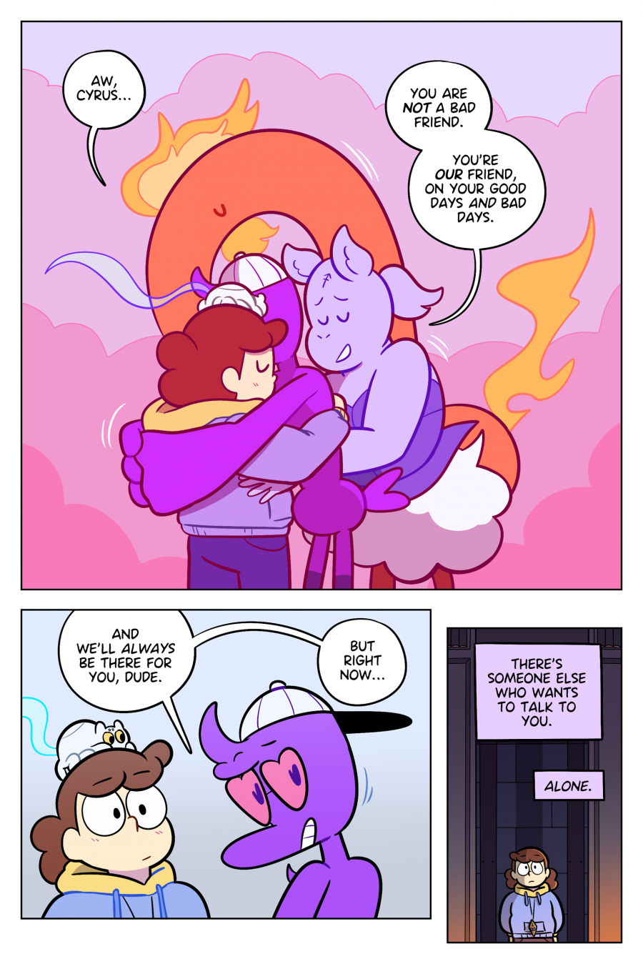 It's been important to me, in this comic, to have moments where when characters offer to hug Cyrus, they don't just hug him - they give him a moment to react and consent to the hug. Sometimes you just don't want someone to touch you, even someone you're close with, and that's OK.