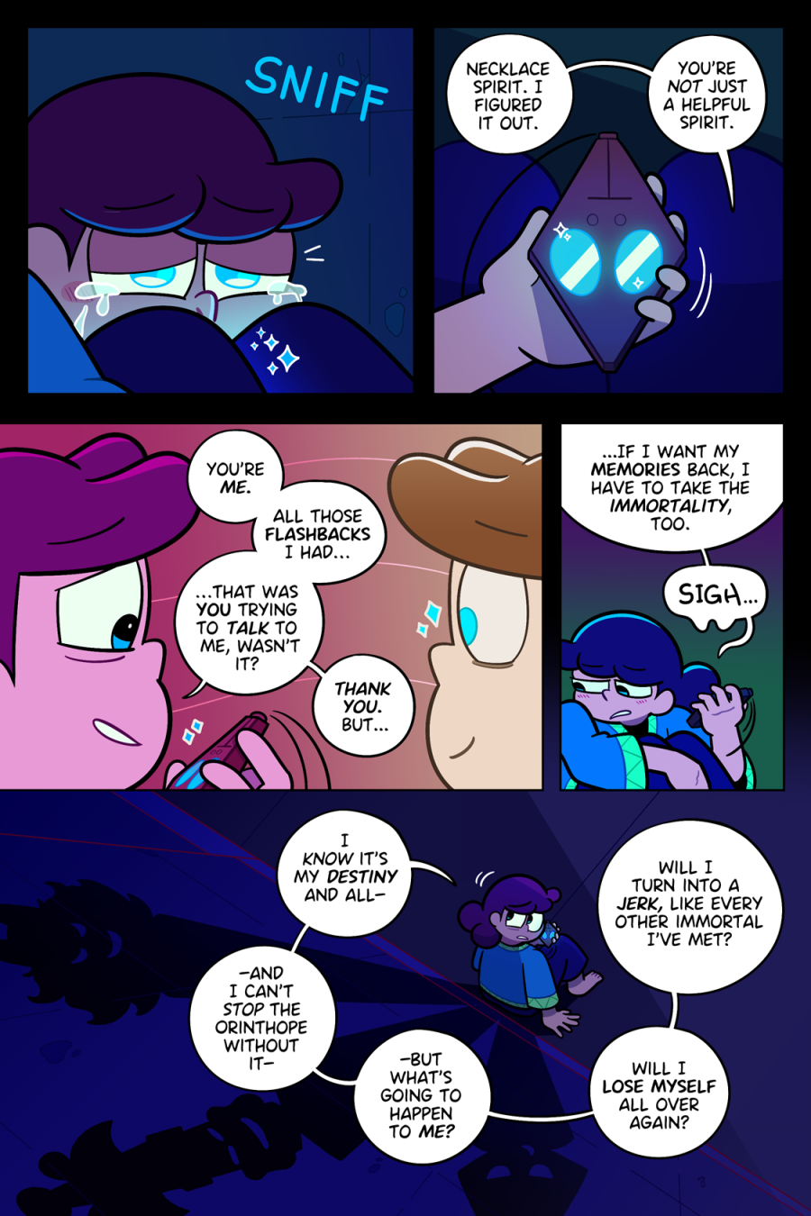 Yes that's right, it was Cyrus in Cyrus's necklace all along! Specifically, it was his memories, which had been separated from his personality and put in the necklace (along with the immortal Muse soul). That's why the necklace spirit was always on the same page as Cyrus - they're the same guy! And it makes pages like this very, very ironic.