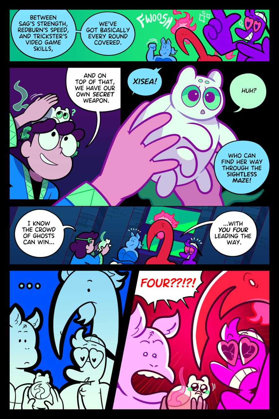 Remember when Cyrus asked Xisea if she could find her way through the Sightless Maze, the first round of the Tournament of Souls, using her "retrace steps" ability? Yeah, that was a set-up for this page. Guilty as charged!