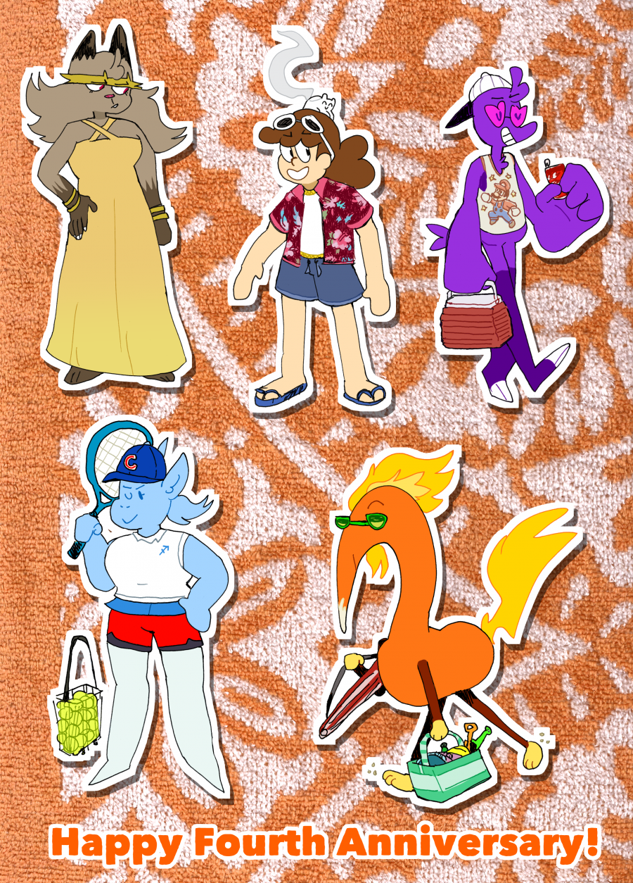 Today marks the fourth anniversary of my webcomic! I wanted to do something simple and fun, so I decided to draw the main characters in summery outfits using a regular ballpoint pen. I enjoy sketching in pen! It is certainly faster than drawing on the computer.