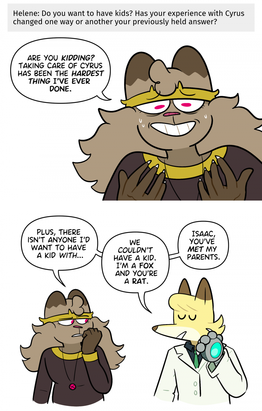 Helene may be someone who overestimates her abilities in areas she has no experience in... but when it comes to raising kids, she knows better. (That being said, there is an AU where Helene has a kid... but a lot of things had to change from the prime universe to get her to that point.)