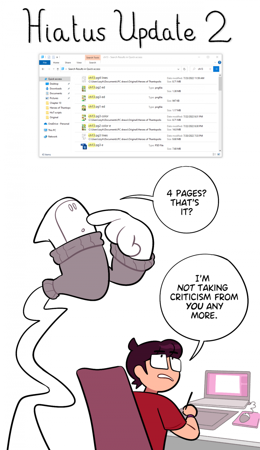 As you can see from my file explorer screenshot, I've got the beginning of a buffer for Chapter 13! Four pages is about a month of posting, which is great to have.